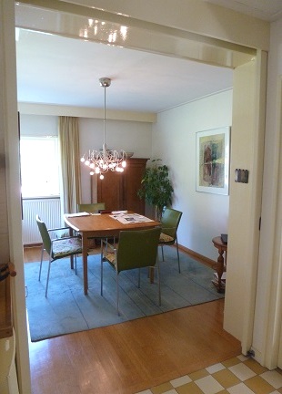 naar een ander zitje (in de eetkamer) bij de openslaande deuren.