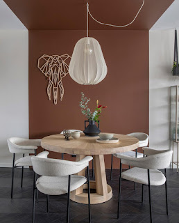 Het is niet perse de kleur die ik zo mooi vind, maar wel het effect van de afstekende kleur op de wand en het plafond die een intieme en beschermde plek maakt voor de tafel.